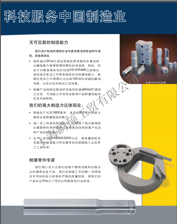 肯纳金属自1938年建立之初至今,已经获得500多项有 关硬质合金制造方面的专利。为保证产品自始至终具备最 好的品质,肯纳自己冶炼矿石,研磨原料,并进行配粉, 压制,烧结,研磨/抛光,这样可使肯纳有灵活的能力生 产各种牌号材料及成品以更好地满足客户特定的要求。 KezizTM 烧结工艺是肯纳的专利之一,使用这种独创工艺, 肯纳成为世界上第一个规模化生产表面和内部几乎无缺陷 的碳化钨/硬质合金材料的制造商。无可匹敌的质量保证 体系,检测设备和行业经验,肯纳产品检测水平可以达到 军工和核工业系统的标准。肯纳的目标是确保客户每一次 从肯纳获得的产品都是完美的产品。 通用牌号CD-650是肯纳金属在冲压模具行业应用的 一个经典牌号,具有极佳的性价比,在北美,欧洲以及中 国市场已有十余年的历史。